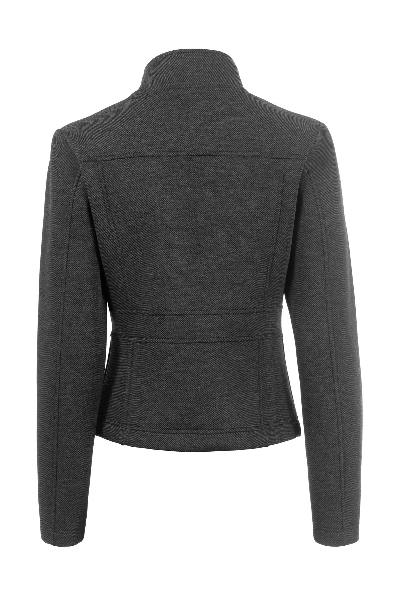 - Short, fitted stand-up collar jacket with flattering seams